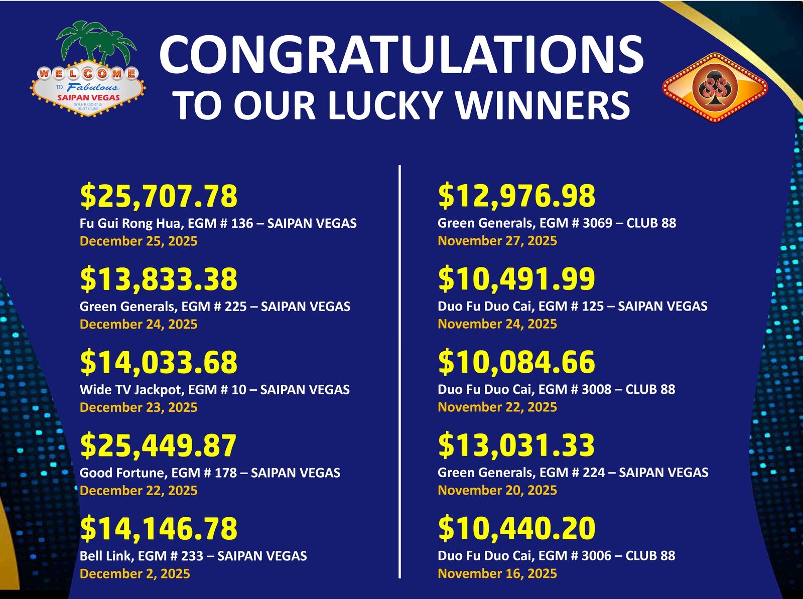 Join us at Saipan Vegas Resort and Club 88 for your chance to win big! You could be the next on this list. Congratulations again to our lucky winners, and thank you to all our guests for making Saipan Vegas Resort and Club 88 the place to be!